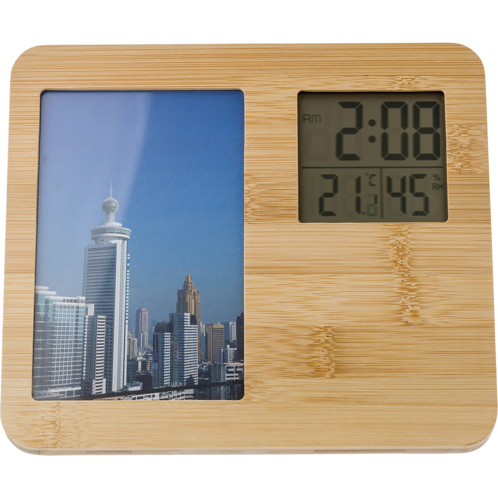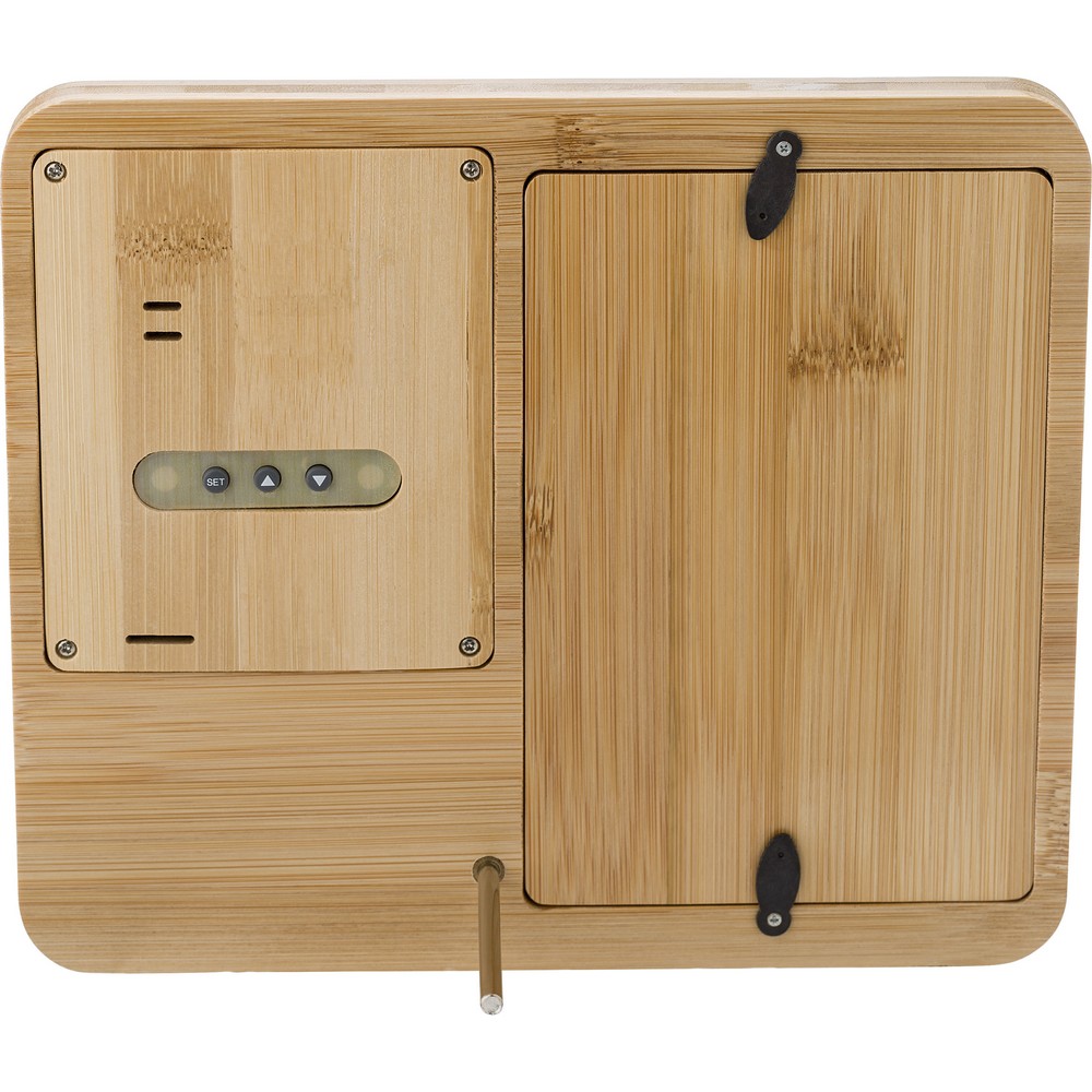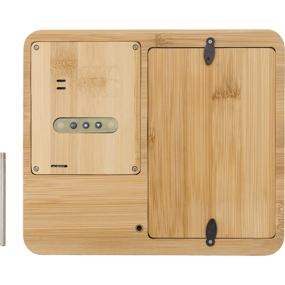 Entdecken Sie die wetterfeste Eleganz der Bambus-Wetterstation – der ideale Werbeartikel für Ihre Marke. Mit Maßen von 21 x 18 x 1,5 cm und einem Gewicht von nur 390 g vereint dieses Produkt Funktionalität und Ästhetik. Aus hochwertigen Materialien wie Bambus und Glas gefertigt, bietet es nicht nur aktuelle Wetterdaten, sondern auch einen stilvollen Fotohalter.